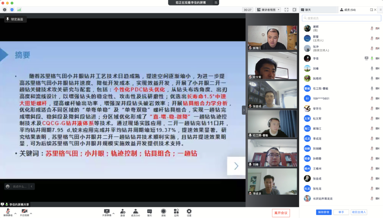 在为期两天半的答辩过程中,来自公司石油工程公司的阮敏、刘峰、曹毅三位评委老师不辞辛劳、认真负责,仔细聆听每一位员工的陈述,员工们认真回答评委老师提出的每一个问题,公司两名管理老师全程参与线上统筹协调,答辩过程紧张而有序。