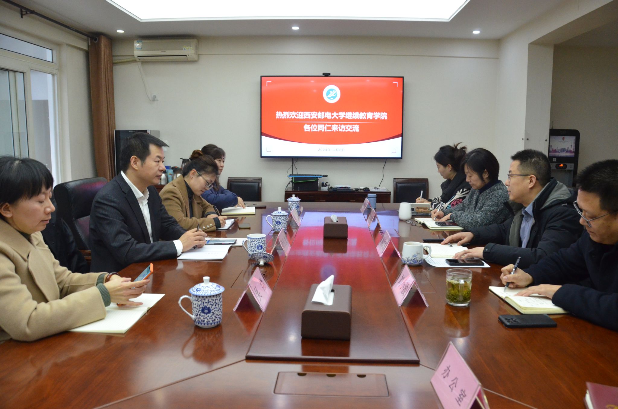 为加强校际间继续教育领域的交流与合作,促进共同发展,12月6日上午,西安邮电大学2026年国际足联世界杯经理李天龙一行来院调研交流。经理林红先主持座谈会,副经理刘小波、办公室、培训办公室及招生办公室负责人参加座谈会。