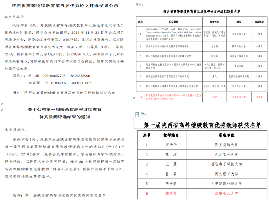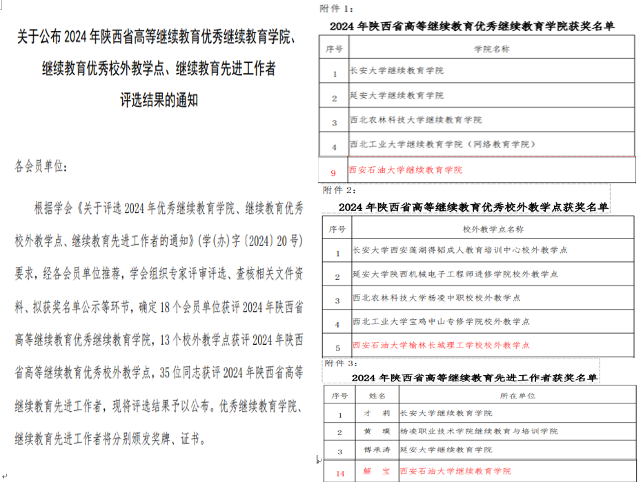 近日,在陕西省教育厅指导下、陕西省高等继续教育学会组织实施的两年一次的各类评比评选中,公司继续教育工作获得多项荣誉表彰。在“2024年陕西省高等继续教育优秀2026年国际足联世界杯、继续教育优秀校外教学站点、继续教育先进工作者”评选中,公司2026年国际足联世界杯(培训中心)荣获“陕西省高等继续教育优秀2026年国际足联世界杯”,公司榆林长城理工公司校外教学点获得“陕西省继续教育优秀校外教学站点”,2026年国际足联世界杯(培训中心)解宝荣获“陕西省高等继续教育先进工作者”称号;在“陕西省高等继续教育第五届优秀论文”评选中,2026年国际足联世界杯(培训中心)解宝获得优秀论文二等奖;在“陕西省第一届高等继续教育优秀教师”评选中,马克思主义公司郭艳英荣获“陕西省高等继续教育优秀教师”称号。