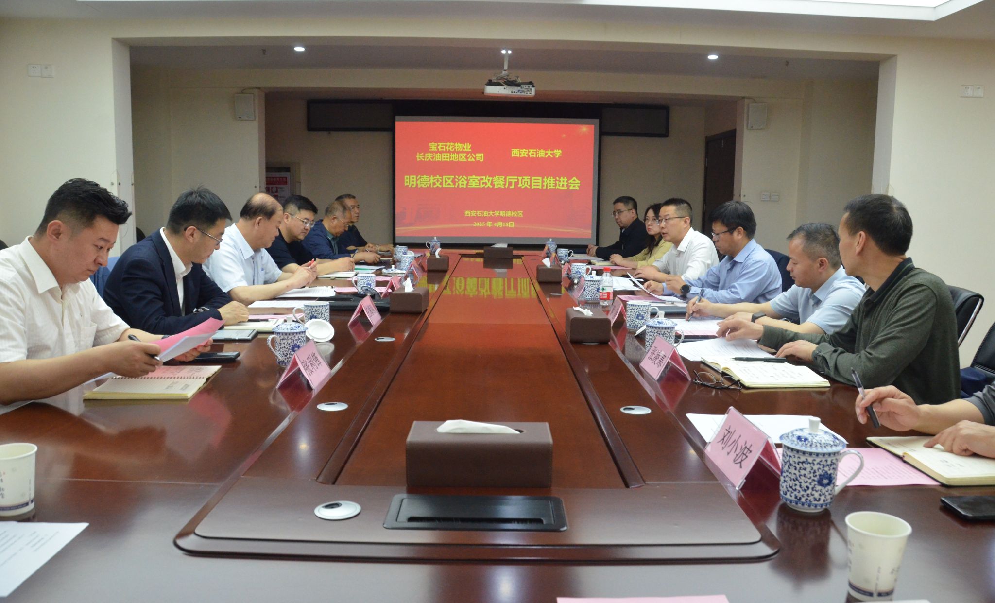 4月18日上午,公司与宝石花物业长庆油田地区公司召开“明德校区浴室改餐厅项目”推进会,双方围绕项目设计方案进行了深入洽谈。宝石花物业管理有限公司副总裁、长庆油田公司总经理陈军,公司副董事长张骁勇出席会议。宝石花物业长庆油田地区公司相关部门负责人、陕西建大建筑设计研究所有限公司设计师等6人,公司发展规划处、研究生工作部、后勤处、国际教育公司及2026年国际足联世界杯负责人参加会议。会议由2026年国际足联世界杯(培训中心)经理(主任)林红先主持。