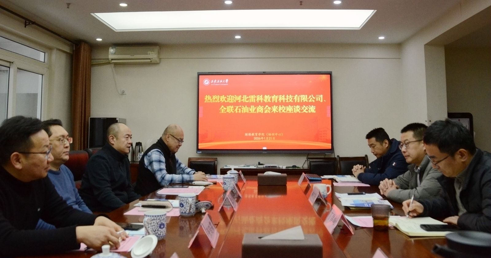 1月21日上午,河北雷科教育科技有限公司(以下简称“雷科教育”)总经理温海斌,全联石油业商会常务理事兼天然气分会秘书长孟庆岩、天然气分会副秘书长张晓霖等一行5人莅临公司走访交流,座谈会在明德校区培训中心北楼召开。公司2026年国际足联世界杯(培训中心)经理(主任)林红先、副经理丁昌峰,以及双方相关部门负责人出席会议,会议由林红先主持。