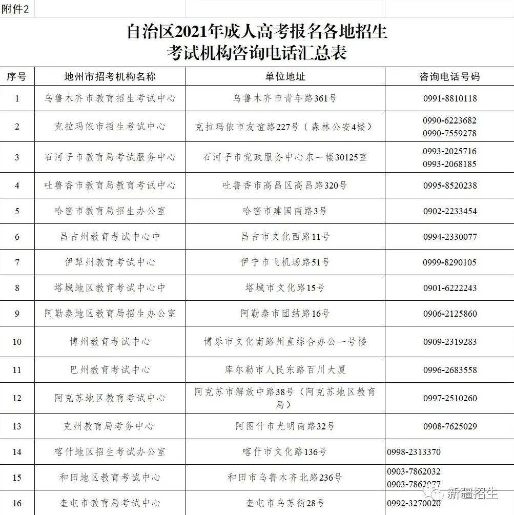 获取我区今年成人高考更多信息,考生可登录新疆教育考试院官方网站“新疆招生网(http:// www.xjzk.gov.cn)”查看《关于做好2021年新疆维吾尔自治区成人高校考试招生工作的通知》(新招委〔202114号)详细内容。报名期间,考生如遇疑问,可在工作时间拨打所在地、州、市招生考试机构、报考资格审核点咨询电话(详见网上报名系统报名点信息)咨询。