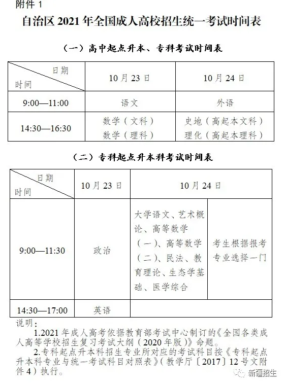 根据教育部安排,自治区2021年成人高校招生全国统一考试(简称“成人高考”)将于1023日至24(见附件)举行。今年设高中起点升专科(下称“高起专”)、高中起点升本科(下称“高起本”)和专科起点升本科(下称“专升本”)三种招生类型。