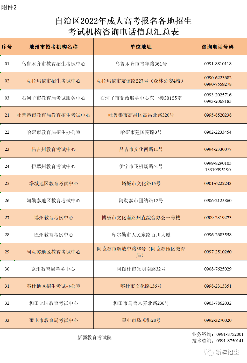 分别在乌鲁木齐市、伊犁哈萨克自治州、塔城地区、阿勒泰地区、克拉玛依市、博尔塔拉蒙古自治州、昌吉回族自治州、哈密市、吐鲁番市、巴音郭楞蒙古自治州、阿克苏地区、克孜勒苏柯尔克孜自治州、喀什地区、和田地区、石河子市、奎屯市等16个地、州、市考区设置报考点。各地、州、市招生考试机构负责本行政区域内(含兵团各师市)各科类、层次的考生报名工作。