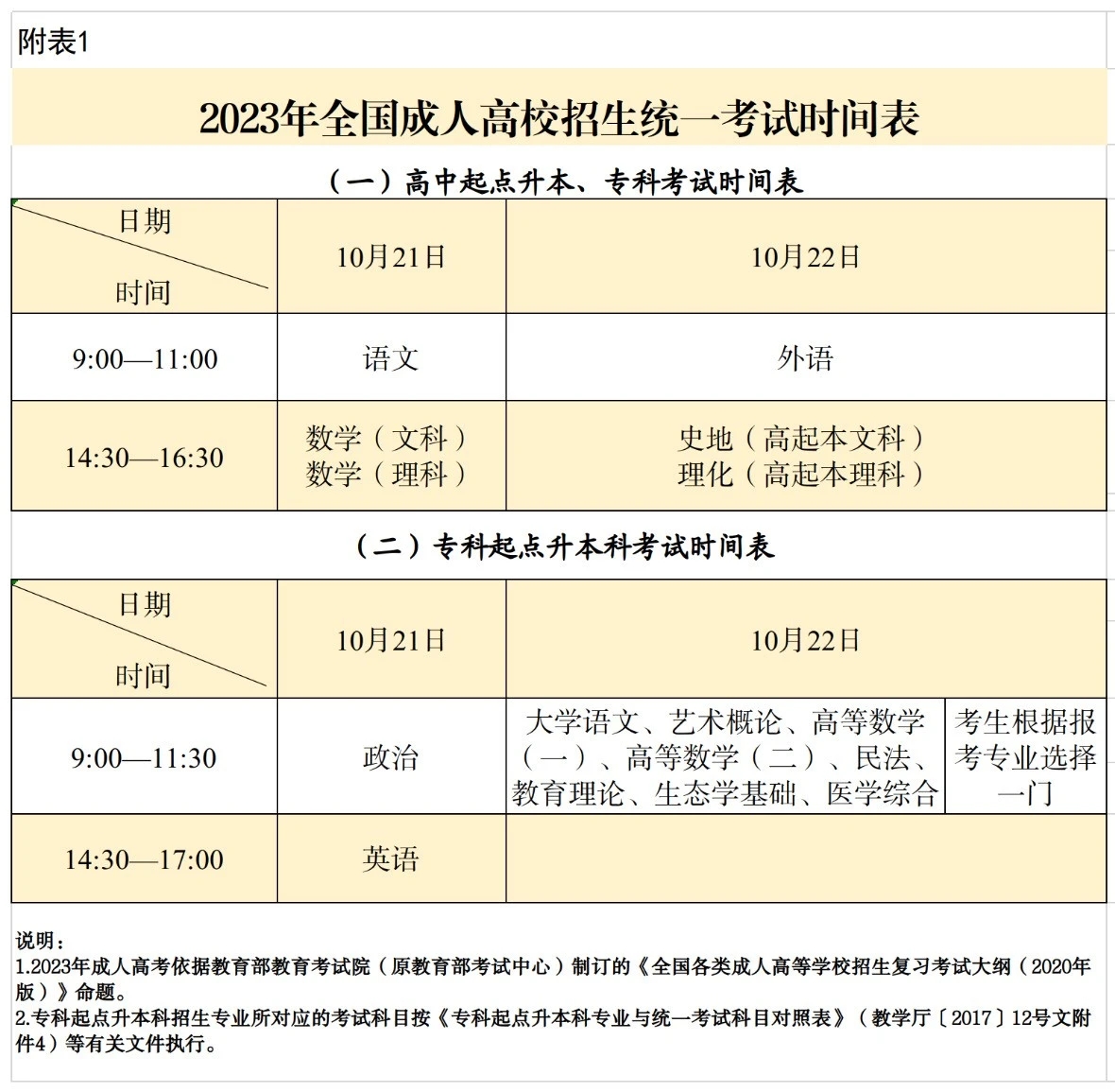 附表:1.2023年全国成人高校招生统一考试时间表