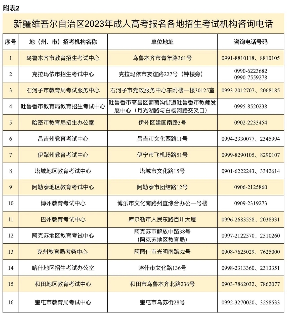 2.新疆维吾尔自治区2023年成人高考报名各地招生考试机构咨询电话