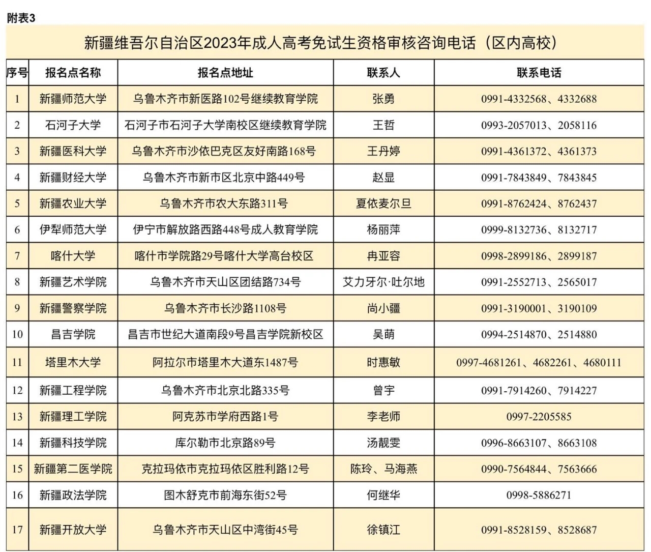 3.新疆维吾尔自治区2023年成人高考报名免试生资格审核咨询电话(区内高校)