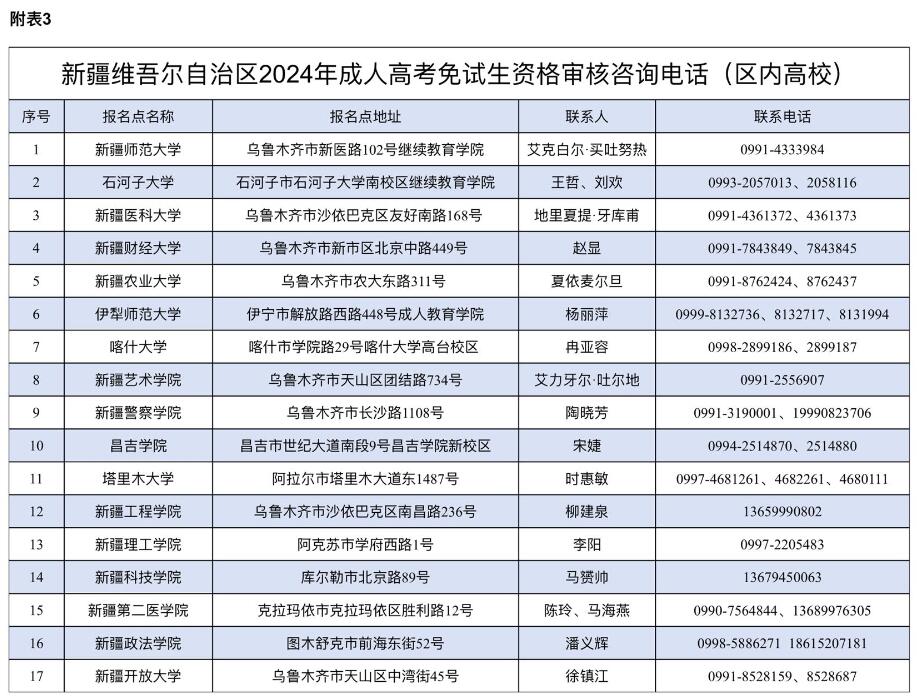 考生可登录新疆教育考试院官方网站查看《关于做好新疆维吾尔自治区2024年成人高校考试招生工作的通知》详细内容。报名期间,考生如遇疑问,可在工作时间拨打所在地、州、市招生考试机构和成人高考报名点咨询电话咨询。