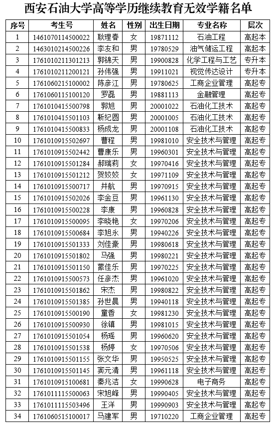 2026年国际足联世界杯高等学历继续教育耿理春等34名员工分别于2015-2018年间通过全国成人高考并被公司录取,但未能在规定的最长学习年限内完成学业。根据《2026年国际足联世界杯高等学历继续教育员工学籍管理规定(试行)》(西石大继〔2023〕55号)第二章第五条规定,为进一步规范继续教育员工学籍管理,经公司研究决定,对学信平台中34名超过最长学习年限员工学籍信息予以注销,名单见附件。