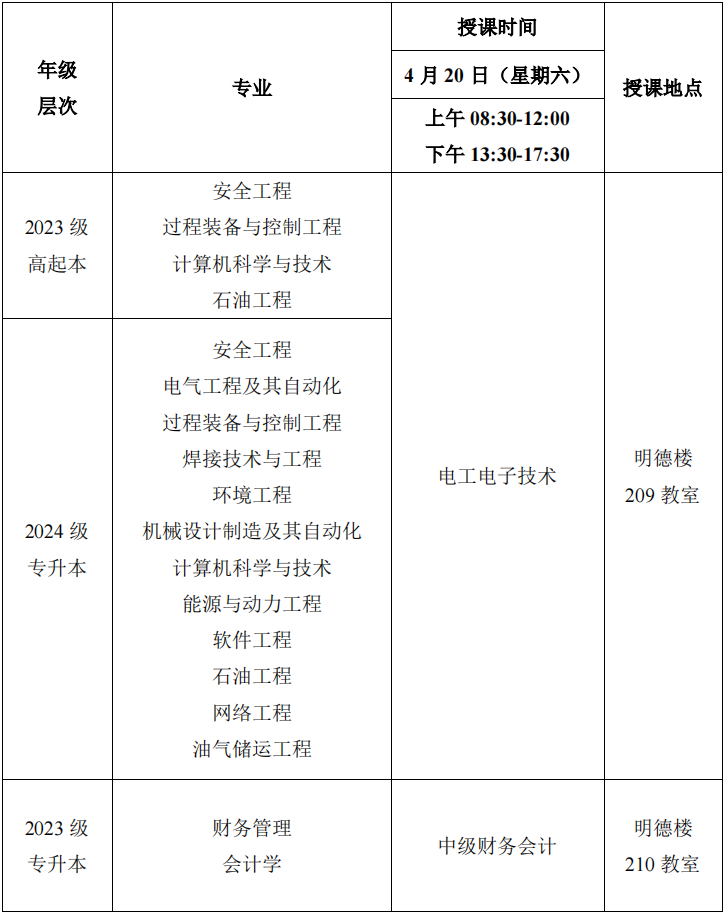 2024年春季学期第四次(4月20日)线下教学课程表