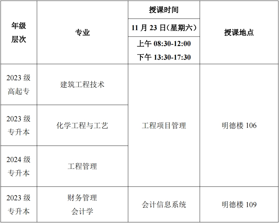 2024年秋季学期第五次(11月23日)线下教学课程表
