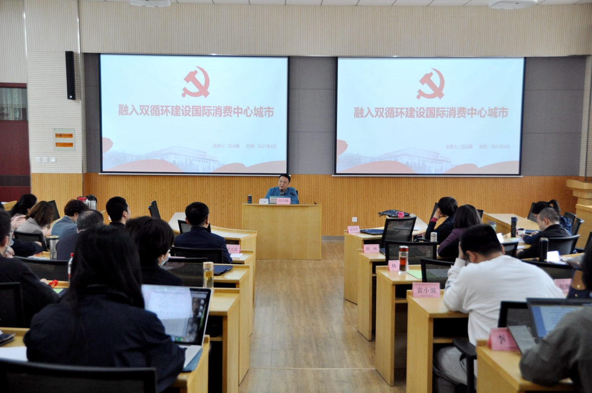 开班仪式结束后,我基地特聘教授、陕西省委党校(省行政公司)白山稳教授为学员做了题为《融入双循环,建设国际消费中心城市》的专题辅导报告。